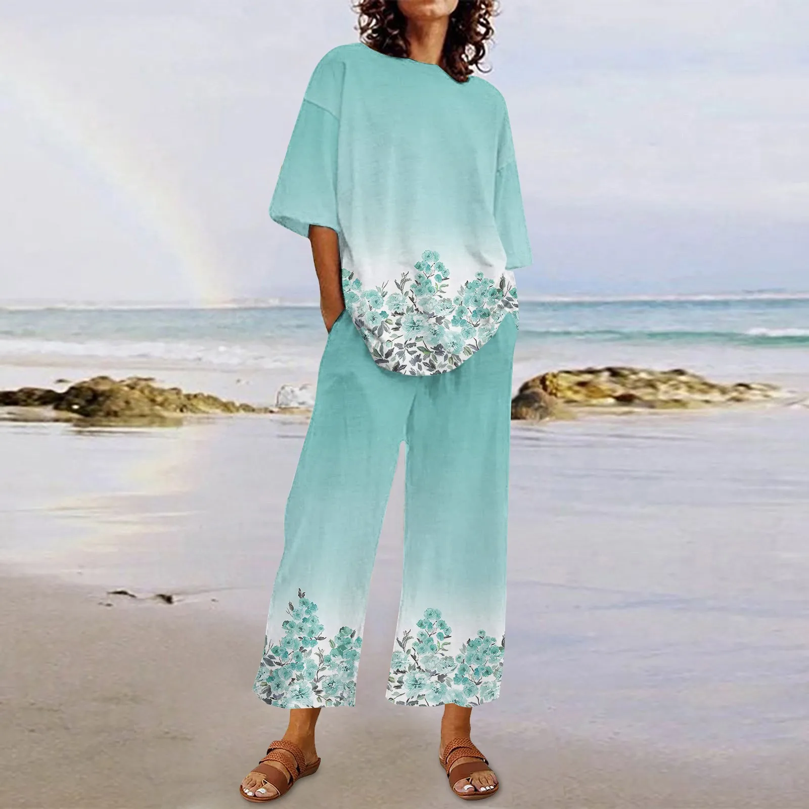Women Casual Short Sleeve Outfit 2023 Summer Fashion Flower Printed O Neck Pocket Suit Female T Shirt Top Pants Two Pieces Set