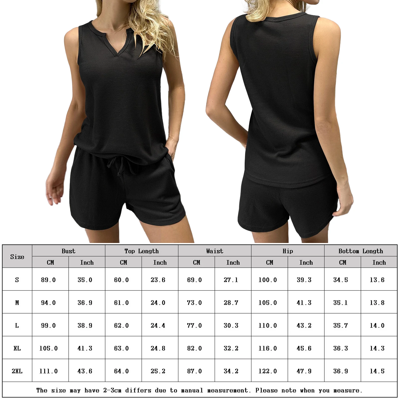 Women 2 Piece Short Pant Set Elastic Waist Waffle Pattern Basic Vest Top Short Pants Solid Color Casual Sleeveless Sports Outfit