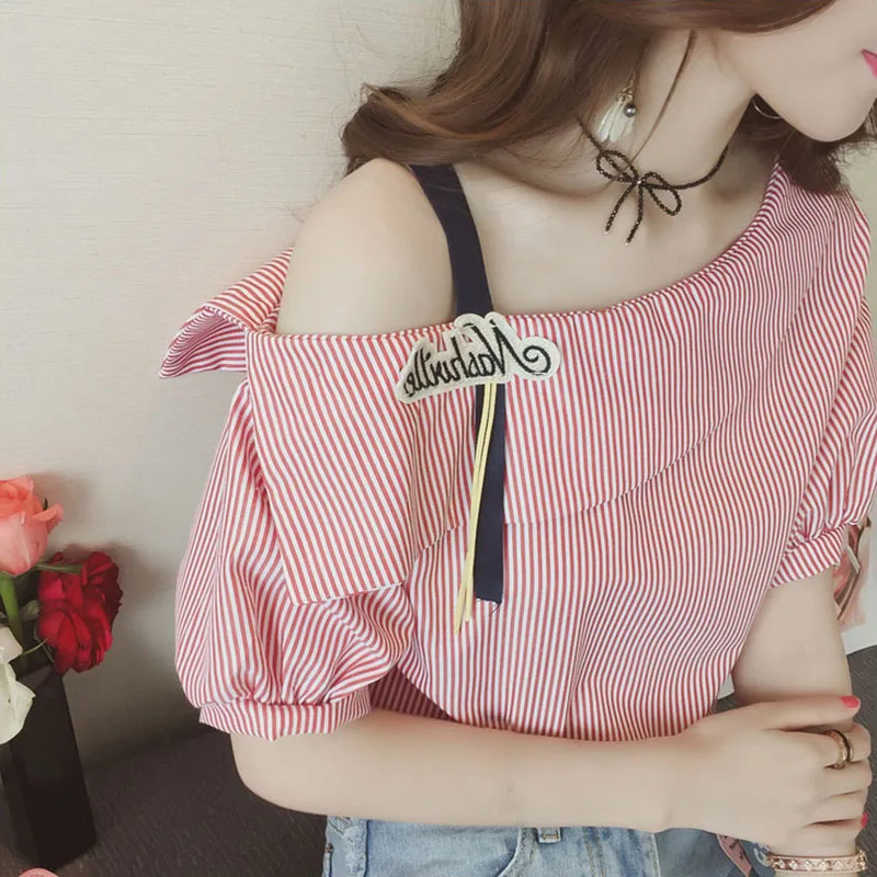 Women Striped Blouses Sexy One shoulder Loose Blue Blouse Lantern Sleeve Women Spring Button Casual Shirt Tops