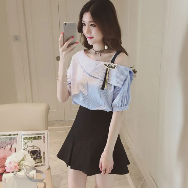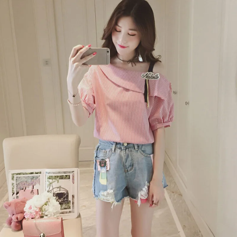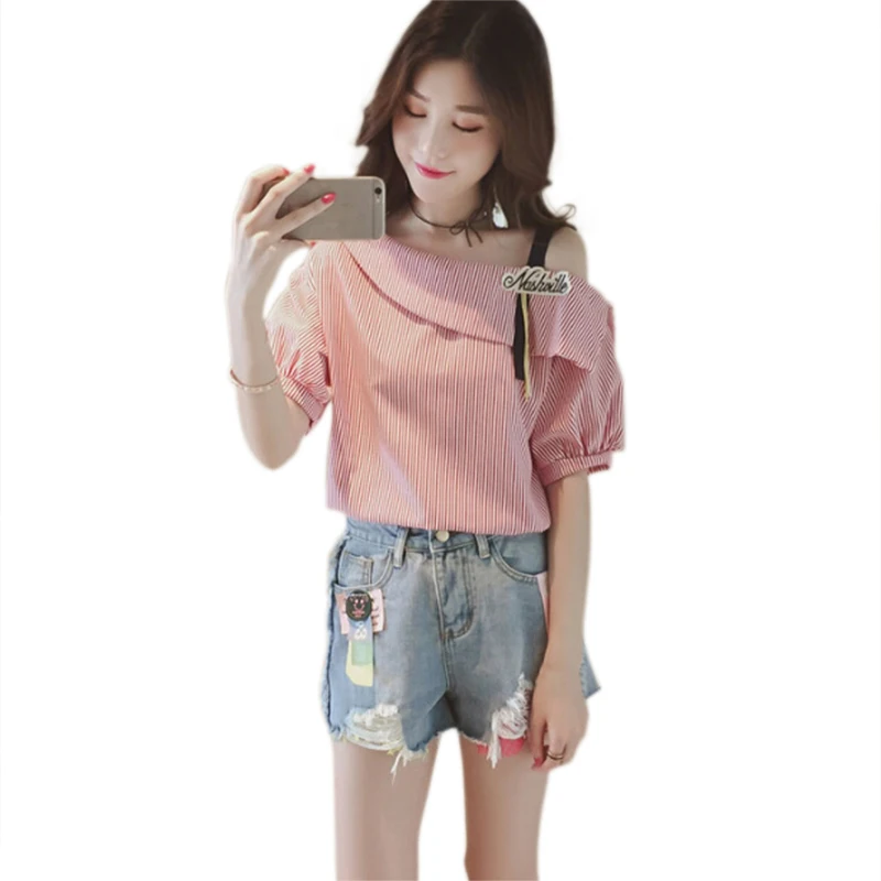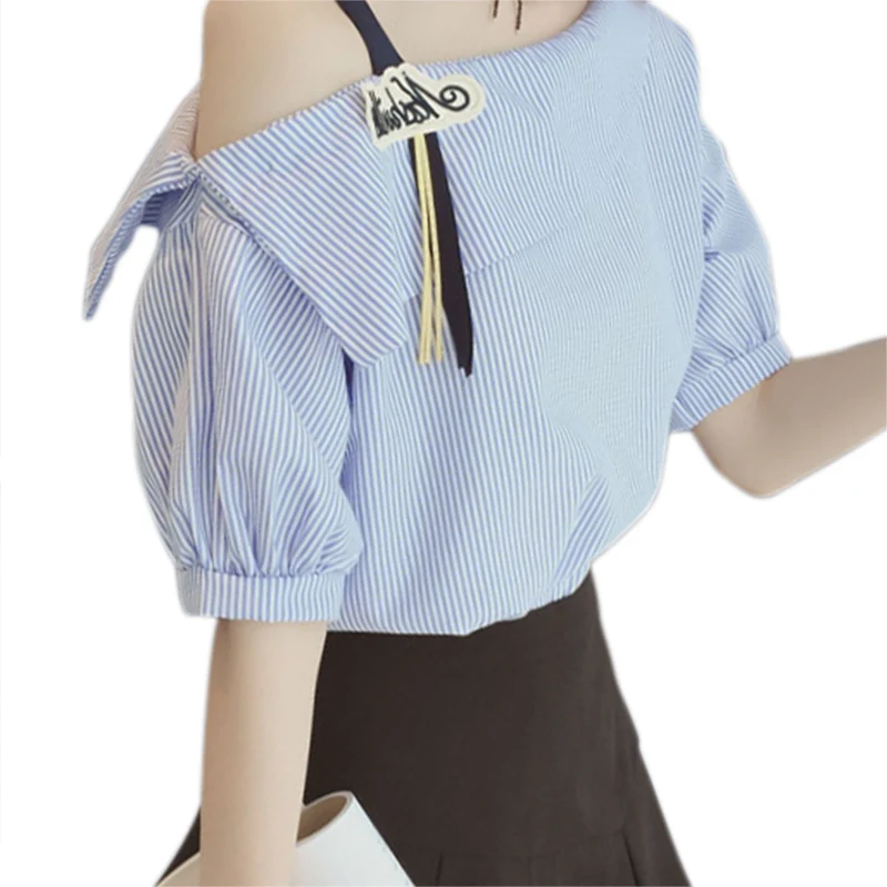Women Striped Blouses Sexy One shoulder Loose Blue Blouse Lantern Sleeve Spring Button Casual Shirt Tops