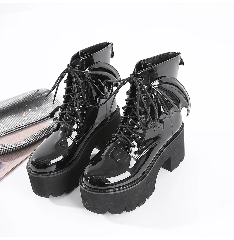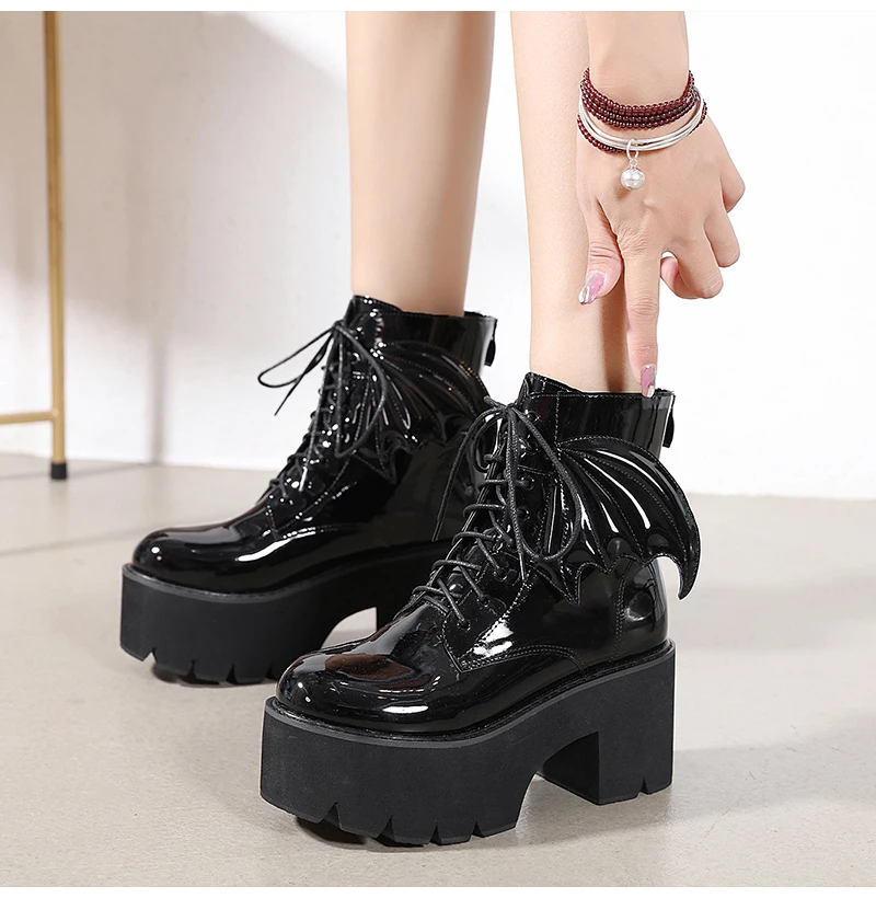 Specification: Women’s Angel Wing Punk Ankle Boots Woman Gothic High Heels Ladies Platform Pumps Female Shoes Women Patent Leather Footwear