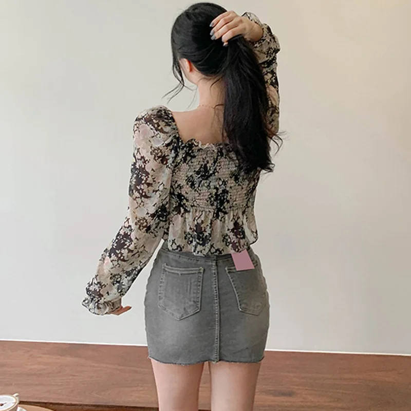 Women’s Blouses Floral Print Chiffon Shirt Spring Autumn Fashion Square Collar Sexy Sweet Long Sleeves Chiffon Shirts