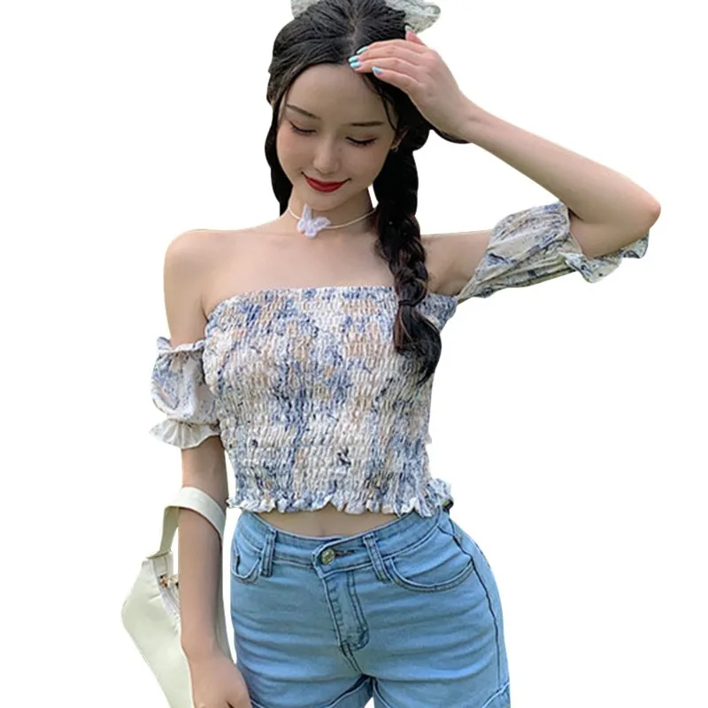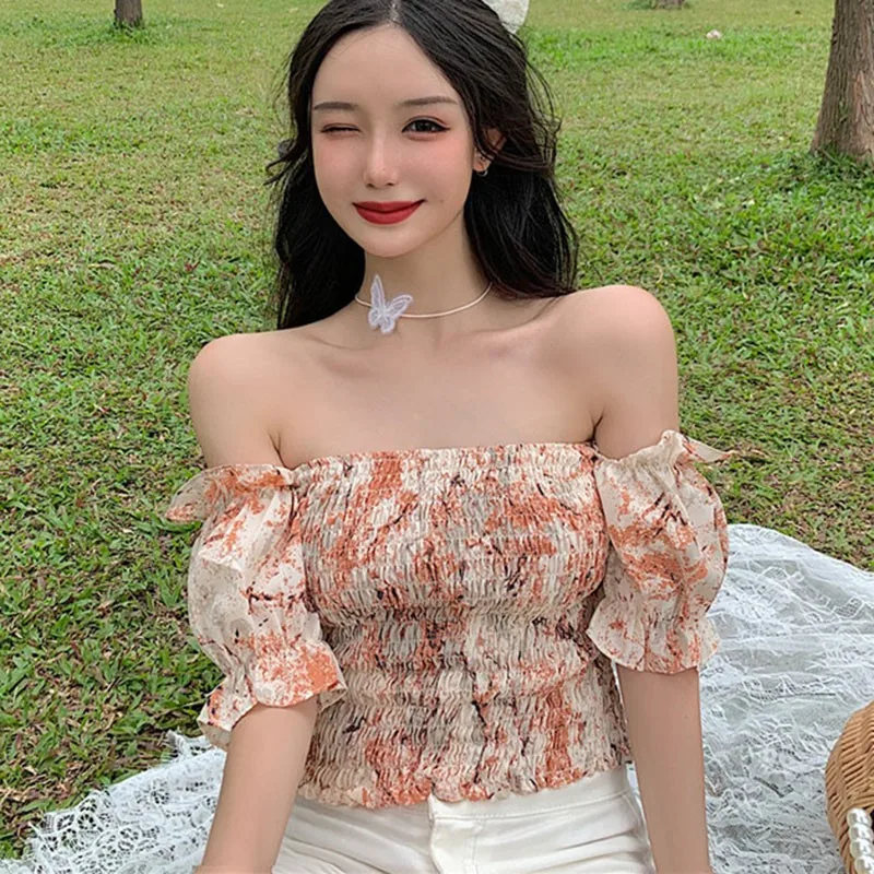 Women’s Fashion Slash Neck Sexy Sweet Pleated Blouses Korean Style Floral Short Sleeve Summer Shirt Tops