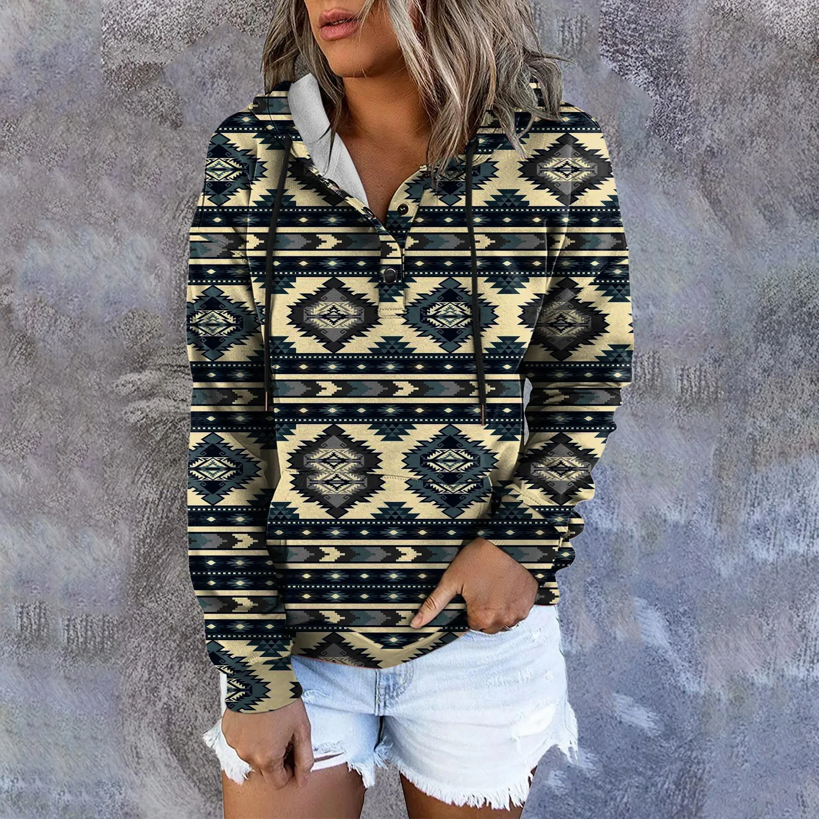 Womens Fashion Sweatshirt Ethnic Print Boho Western Retro Pattern Hoodie Pullover Button Hooded Jacket Woman Winter Clothes