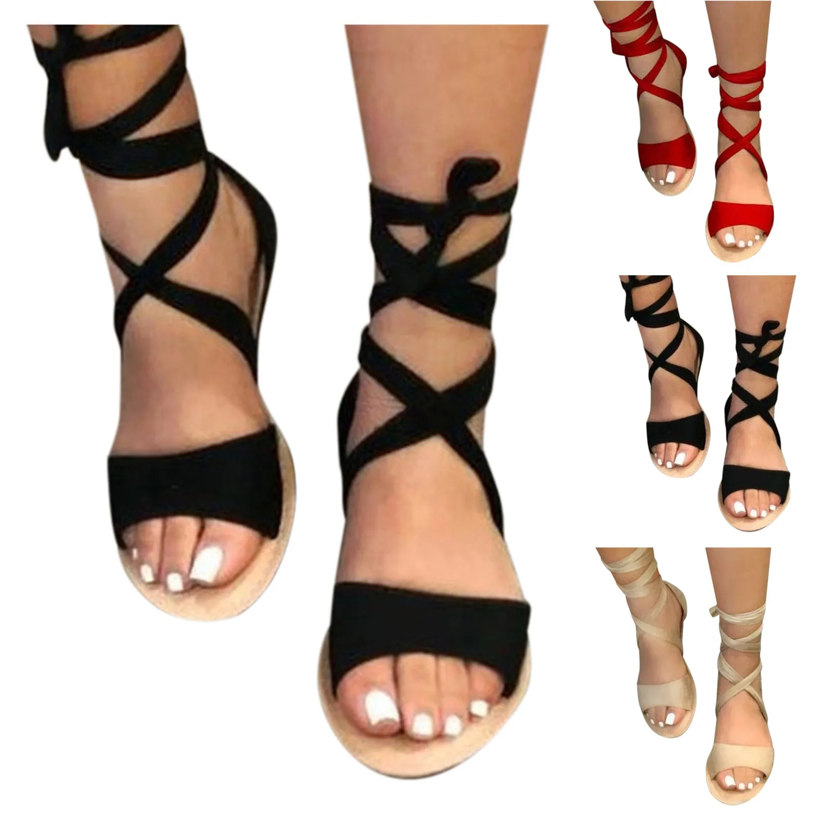 Women’s Sandals Summer Fashion Casual Hollow Roman Strap Large Size Lace Up Hemp Rope Flat Sandals Comfort Beach Shoes Plus Size