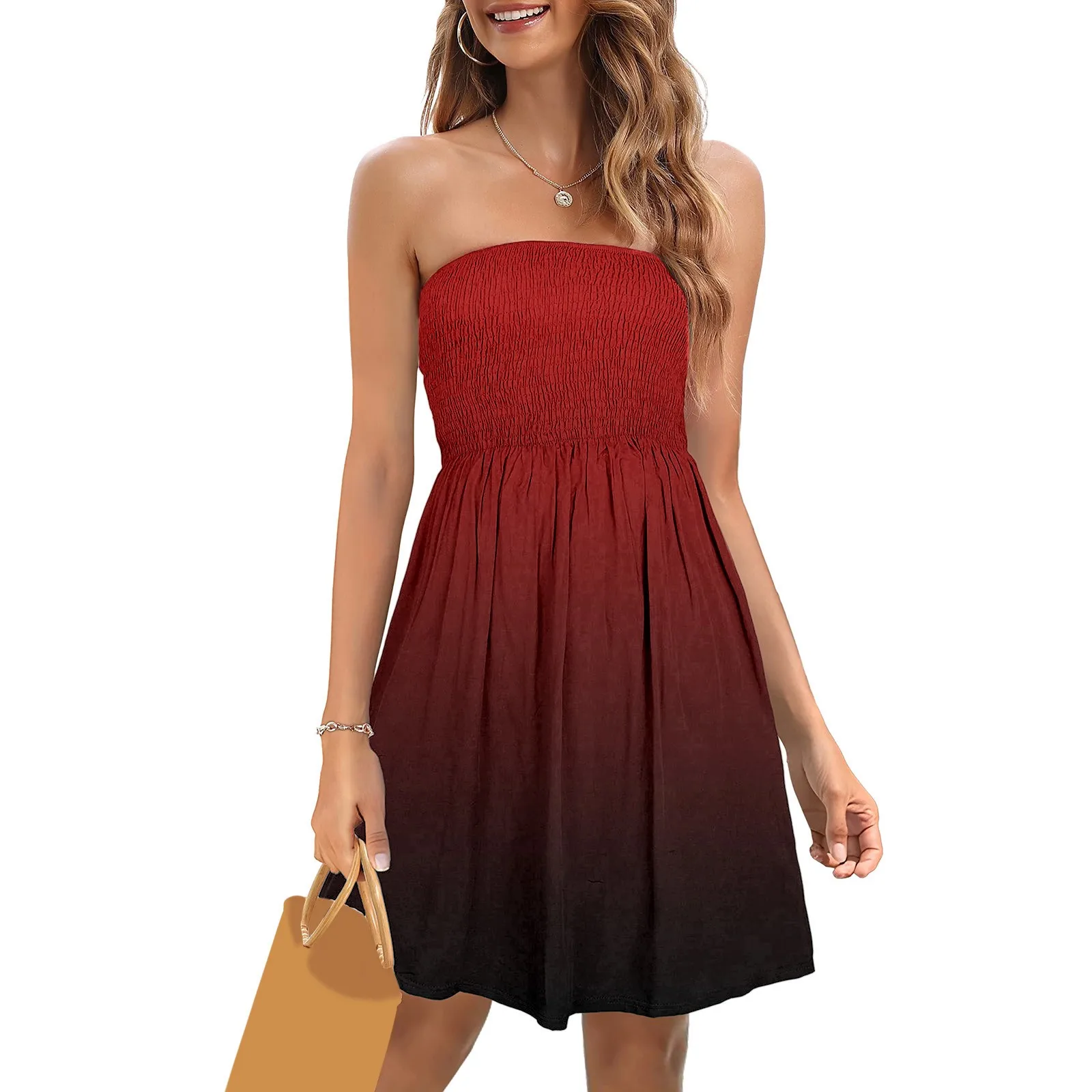 Women’s Summer Strapless Mini Dresses Gradient Smocked Casual Beach Tube Top Dress Cover Ups For Swimwear Bandeau Sundress 2023