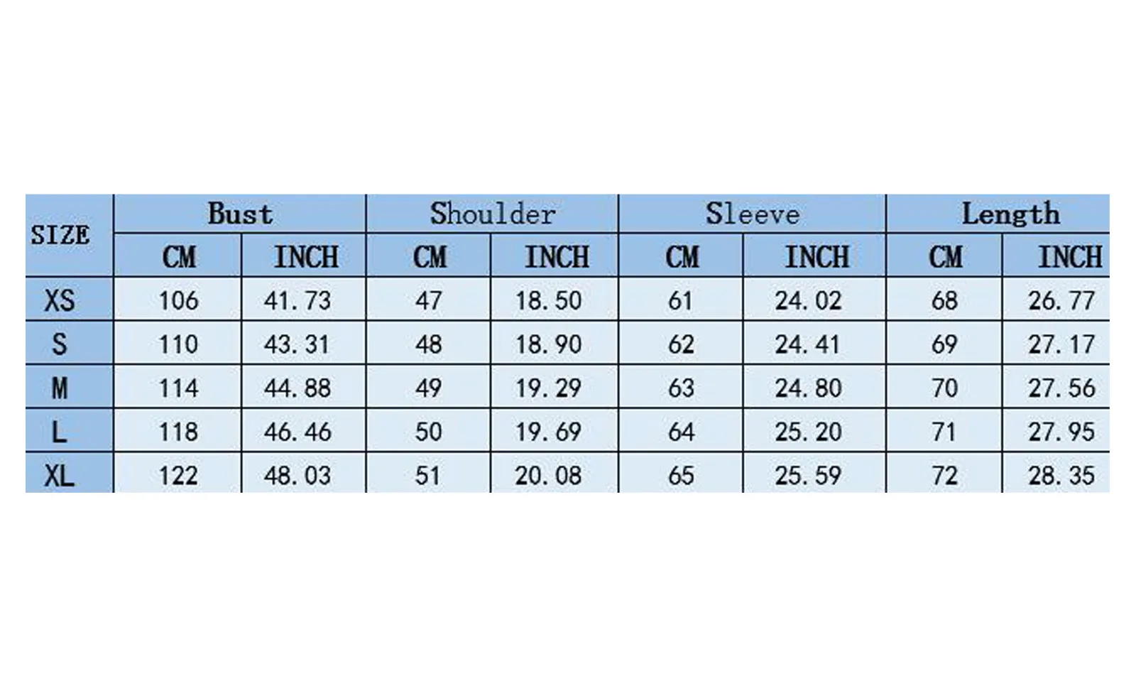 Size:XL US Size:10 UK Size:14 EU Size:38 Bust:122cm/48.03” Shoulder:51cm/20.08” Sleeve:65cm/25.59” Length:72cm/28.35”
