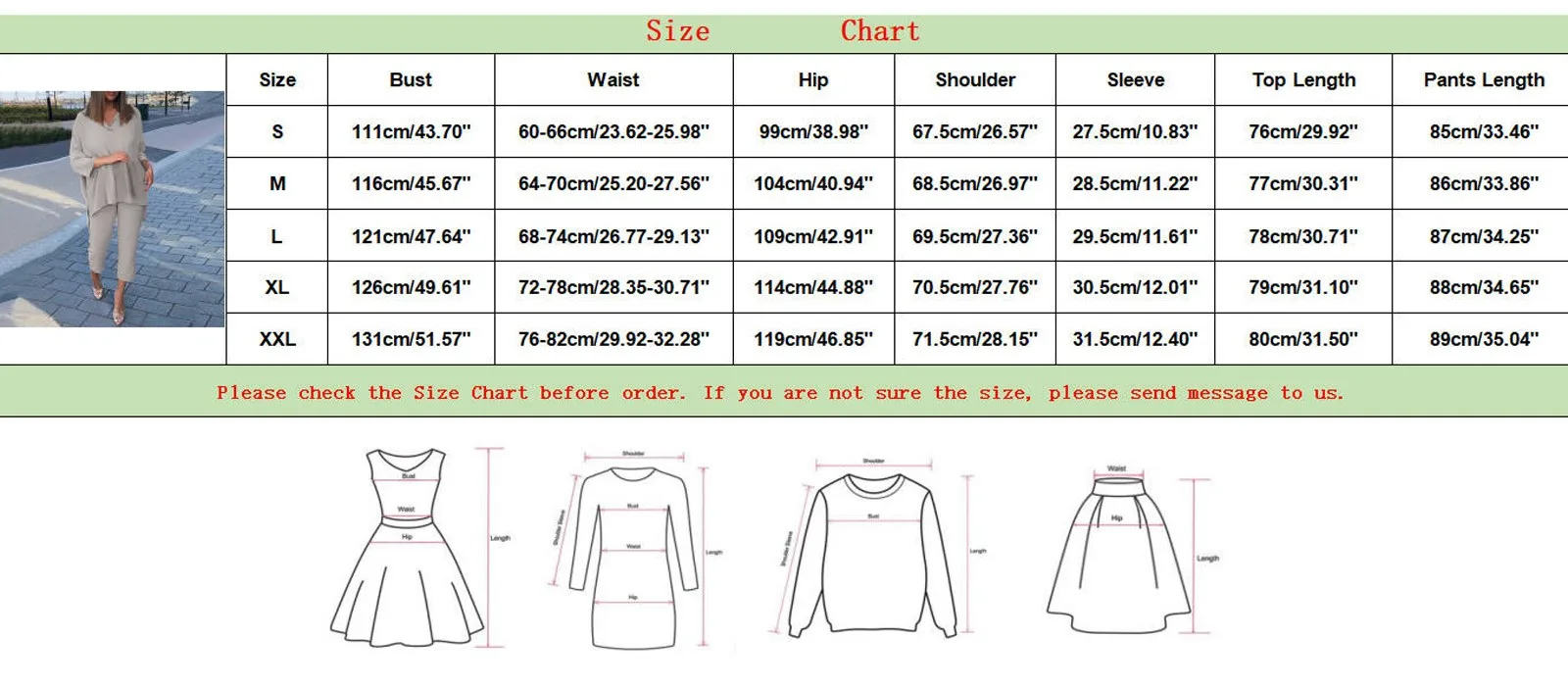 Size:M Bust:116cm/45.67” Waist:64-70cm/25.20-27.56” Hip:104cm/40.94” Shoulder:68.5cm/26.97” Sleeve:28.5cm/11.22” Top Length:77cm/30.31” Pants Length:86cm/33.86”