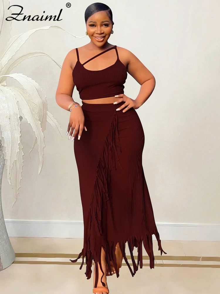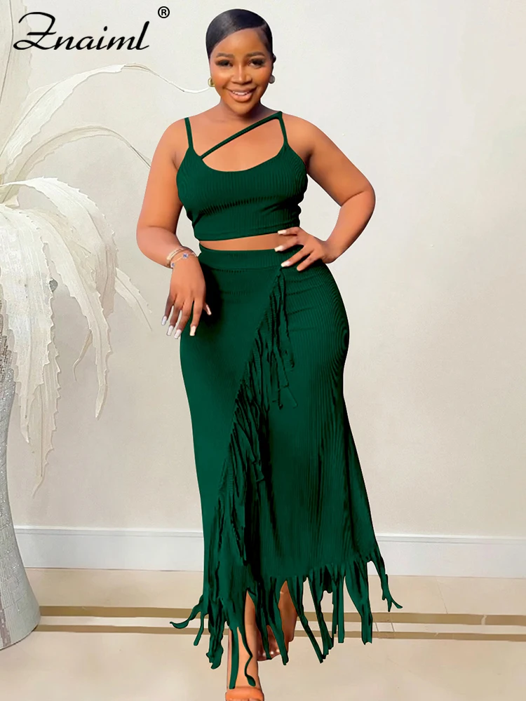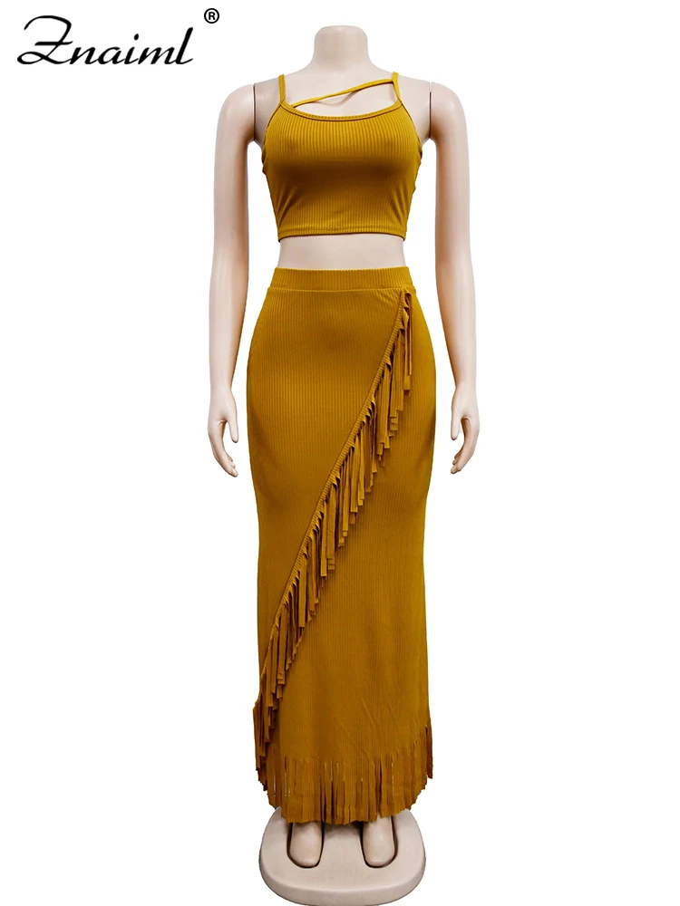 Znaiml Summer Knitted Ribbed Crop Top and Tassel Long Skirt Two Piece Matching Sets for Women Festival Birthday Dress Outfits